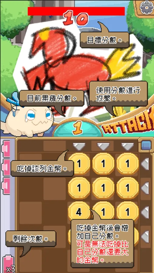 結合四則運算、策略安排行動,在有限的步數內獲得最高的力量擊敗BOSS。