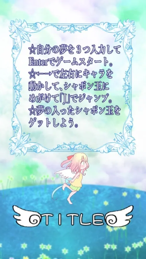 シャボン玉に託した自分の3つの夢を、ANGEL(エンジェル=妖精)さんの力を借り、つかんでいく簡単ゲーム!