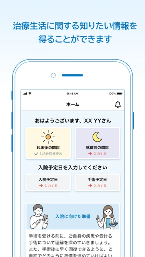 入院に向けた準備や退院後の過ごし方に関する情報がアプリに入っているので、自分のペースで手術や退院後の暮らしを理解できます。