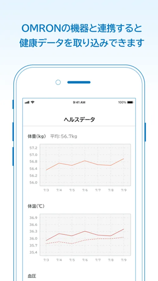 血圧、体重、活動量などの記録データをグラフ形式で表示しながら振り替えることが可能です。