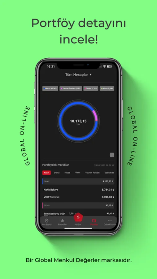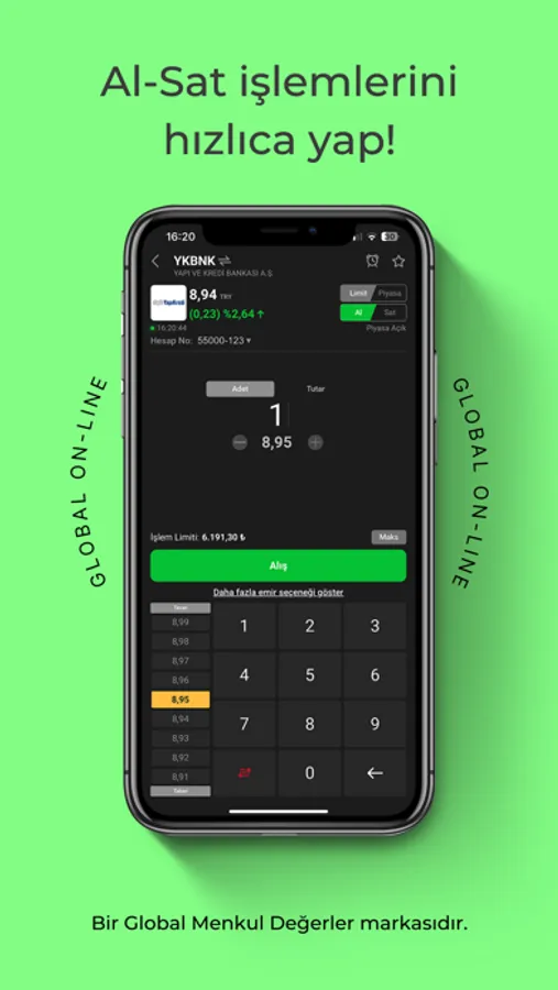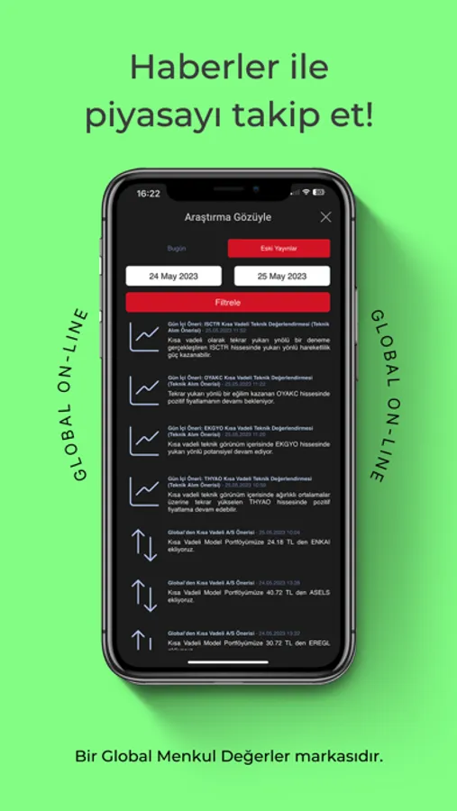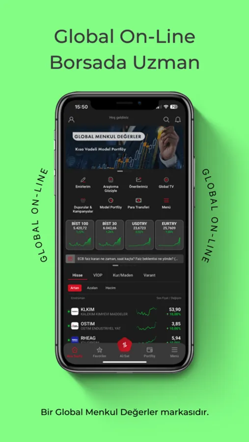 Global Menkul Değerler, 30 yılı aşkın tecrübesi ile istek, ihtiyaç ve risk profilinize uygun; piyasanın sunduğu fırsatlardan öncelikli olarak yararlanmanızı sağlayacak bir borsa deneyimi sunuyor. Global On-Line, uzmanlarımızın yatırım fikirlerini ve piyasadaki en güncel haberleri anlık bildirimlerle iletiyor. Size kalan ise; Global On-Line’ın ayrıcalıklı dünyası ile emirlerinizi hızlı ve güvenli bir şekilde gerçekleştirmek.