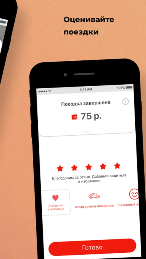 Оценивайте поездку с помощью готовых шаблонов. Занесите водителя в “Избранные”, если понравилась поездка. Посмотрите детализацию платежей.