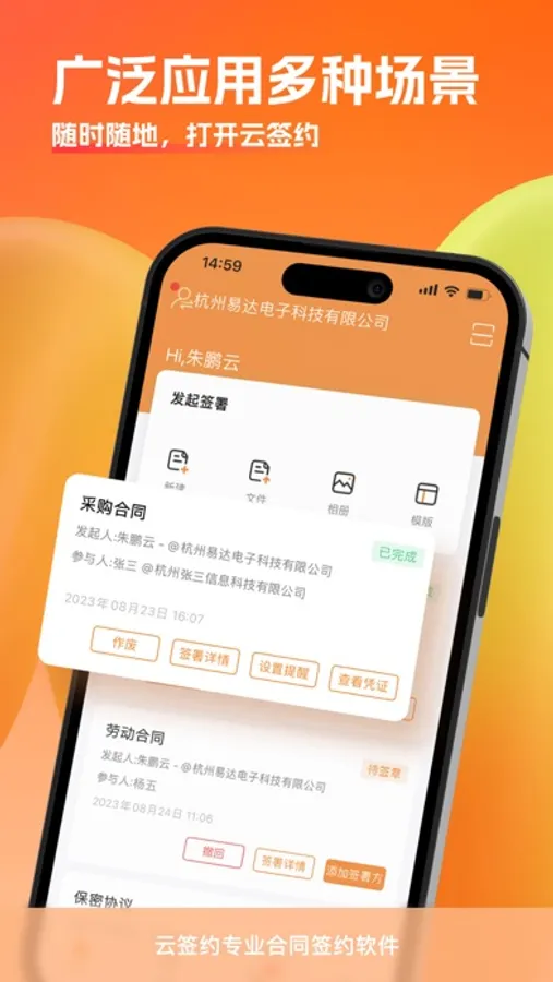 我们严格遵守信息保密法律法规,保护您的合同和个人信息的安全,确保您的权益不受侵害;云签约严格遵照国家相关法律法规,保证用户签署的电子合同文件具有法律效力。