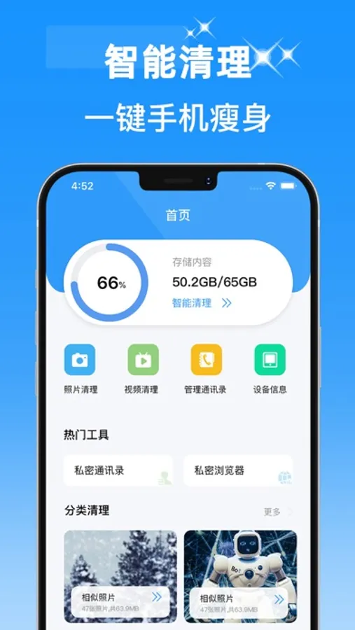 我们专注于手机相册、内存清理的一款工具,一键清理您手机相册重复、相似的照片,是人人必备的手机管家应用。