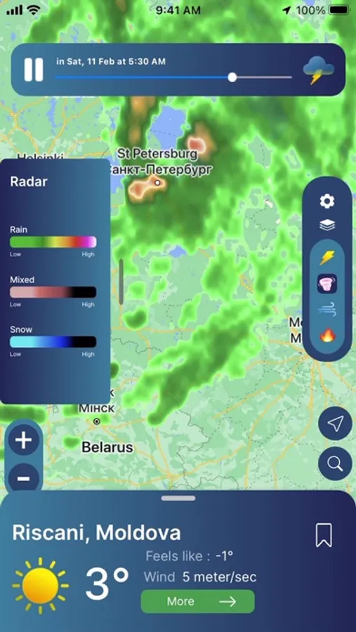 Weather Radar: Live Forecast is an application with which you can track the weather, upcoming precipitation and dangerous disasters in a live format. Stay safe wherever you are. The precipitation radar will display areas where rain or snow falls. The precipitation depth map will display how large and deep the area has been covered by snow or rain.