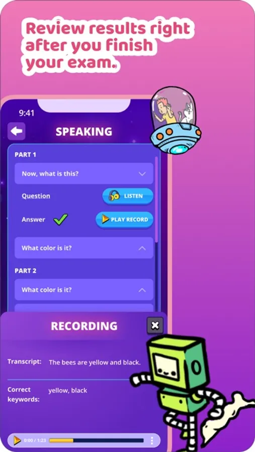 Created by a professional academic team, enthusiastic developers, and talented digital artists, FLYER provides you with diverse, lively, and gamified mock tests that resemble the real Cambridge & TOEFL exams.