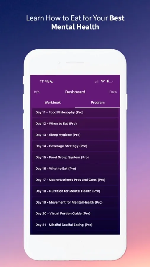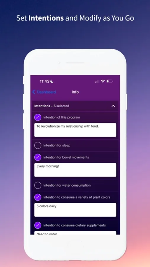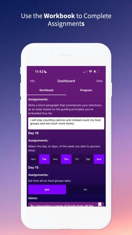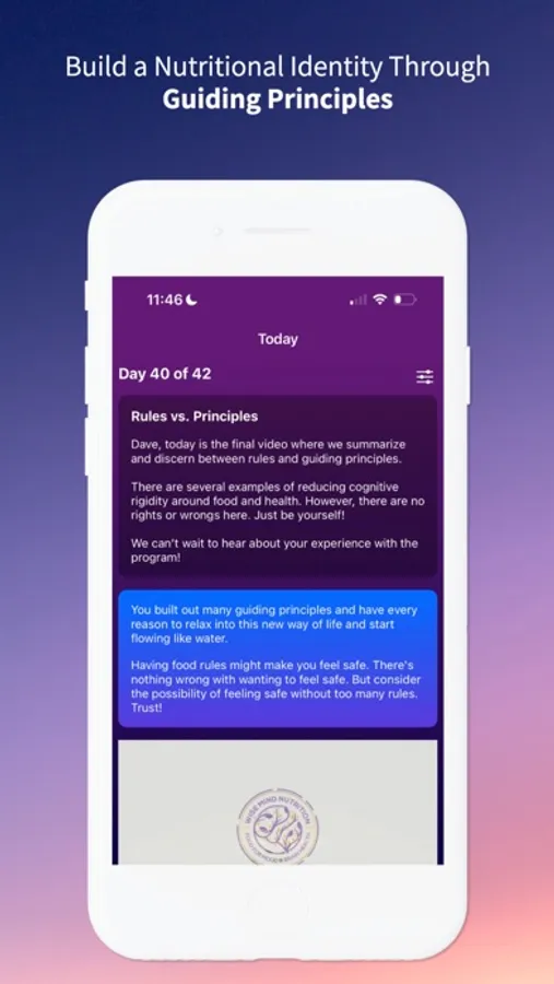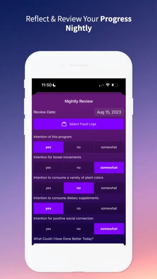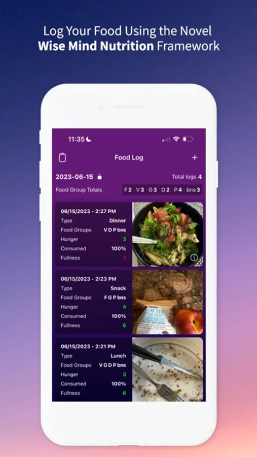 The novel food log is not based on calories and macronutrients. Instead, we emphasize the qualitative aspects of eating, such as food groups, the range of colors, and using internal cues of hunger and fullness to guide you. The approach is designed to be sustainable, so you can continue implementing the framework after you’re done with the app.