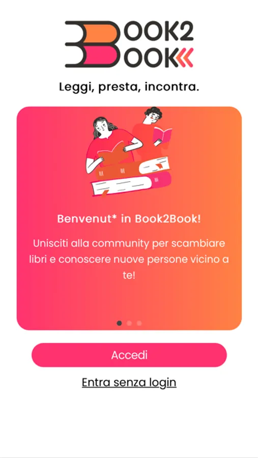 Book2Book (B2B) è un progetto di prossimità e scambio che mette al centro le persone, i libri e i luoghi di aggregazione sociale e culturale, partendo dalla città di Torino. La sua prima implementazione è quest’applicazione, orientata a facilitare l’incontro tra persone nella stessa area geografica. In questo modo, con la piattaforma B2B nasce la prima biblioteca di prossimità d’Italia (e non solo). La biblioteca di prossimità esiste condividendo i libri personali sia di individui che di realtà associative e aggregative del territorio. Book2Book genera così un database di libri della città che viene messo a disposizione della comunità stessa. Il progetto si appoggia ad una rete di enti sul territorio (BookPoint) che hanno scelto di aderire a questa iniziativa, favorendo e rendendo sicuro l’incontro e lo scambio tra le persone. Book2Book è realizzato con il contributo di Fondazione Compagnia di San Paolo