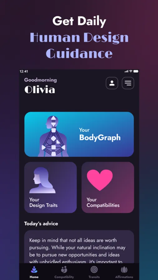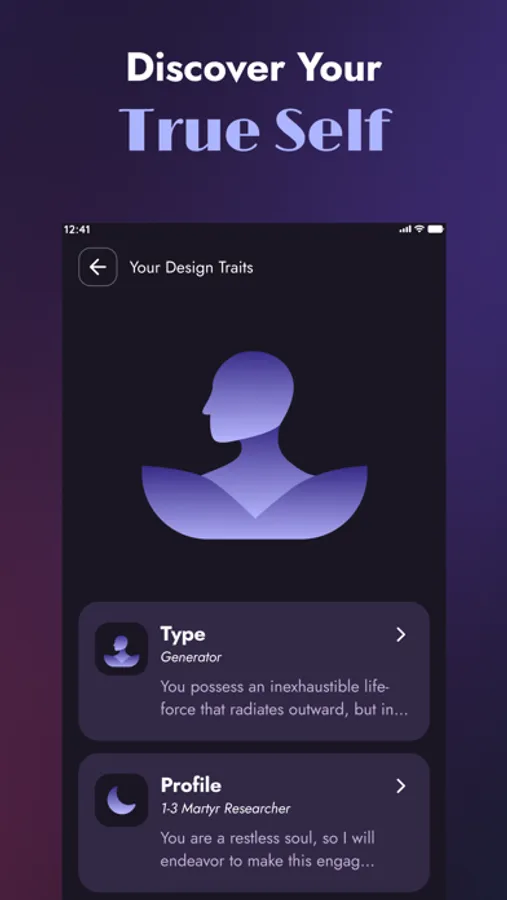 The power of Human Design in explaining energy centers and aura will give you a deeper understanding of the subtle forces at work in your life. Our app will provide personalized insights into your spiritual path, including affirmations, cosmic advice, and nebula readings.