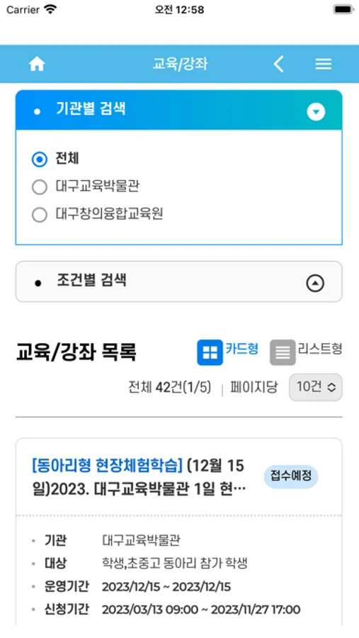 - 견학 체험, 교육/강좌, 공연/전시, 수련원 시설의 정보를 확인할 수 있습니다.