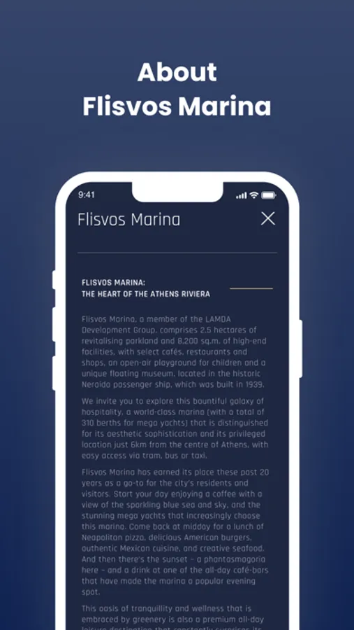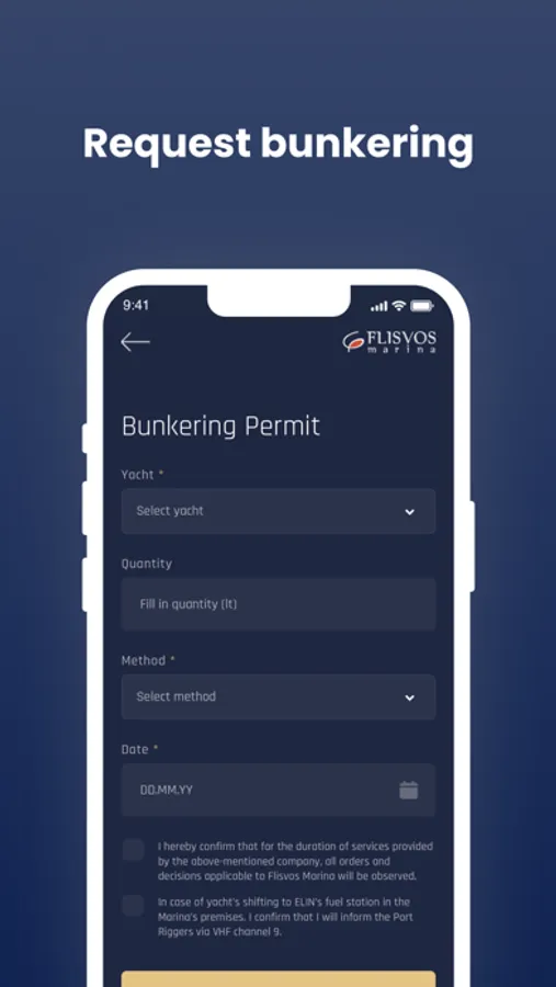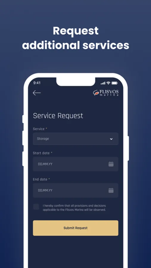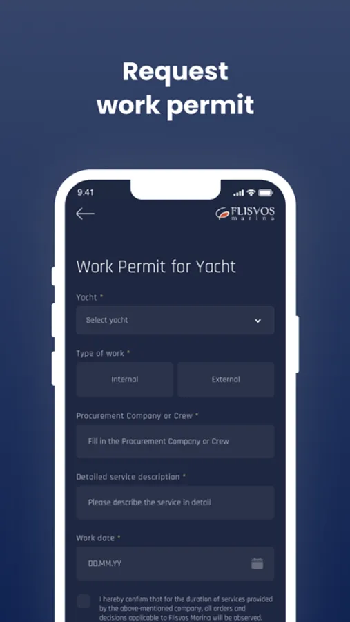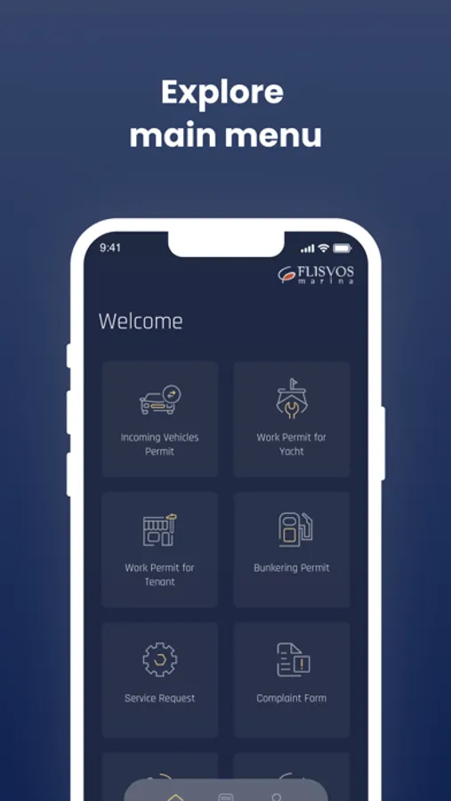 Download the Flisvos Marina app complimentary on your tablet or phone to manage all important entrance procedures concerning your yacht or business. Submit incoming vehicles and work permits with the click of a finger. Request a Wi-Fi connection and storage room. Be notified on the progress of your request in real time.