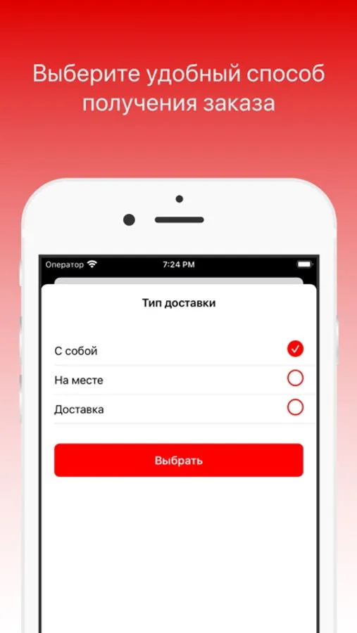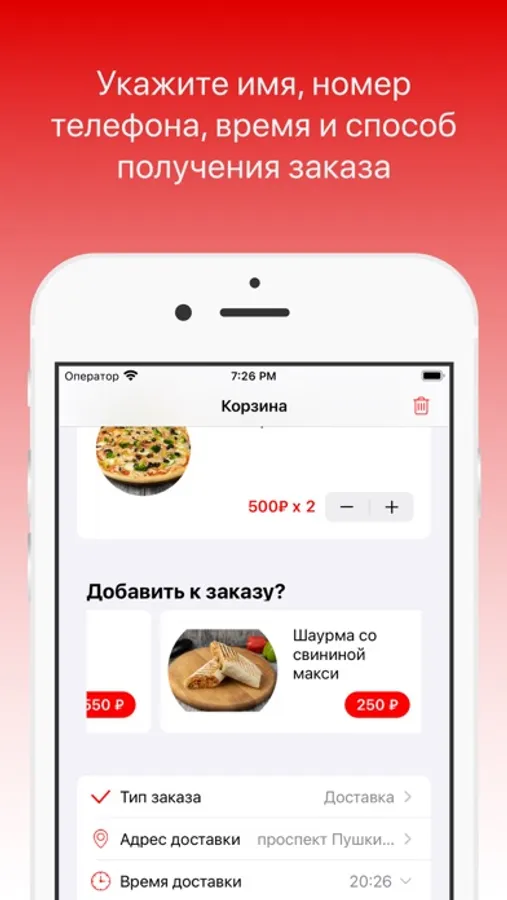 Укажите время, когда хотите прийти за своим заказом или выберите доставку с указанием времени и адреса доставки.