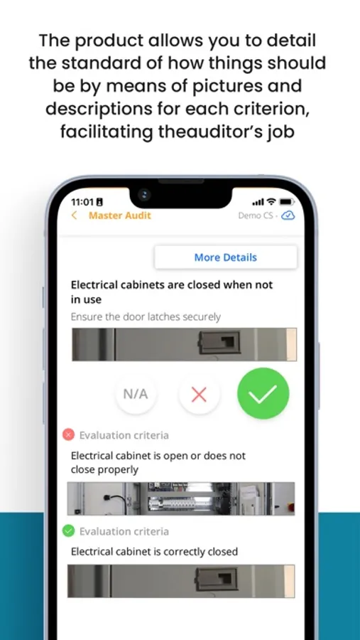 - The product allows you to detail the standard of how things should be by means of pictures and descriptions for each criterion, facilitating the auditor’s job
