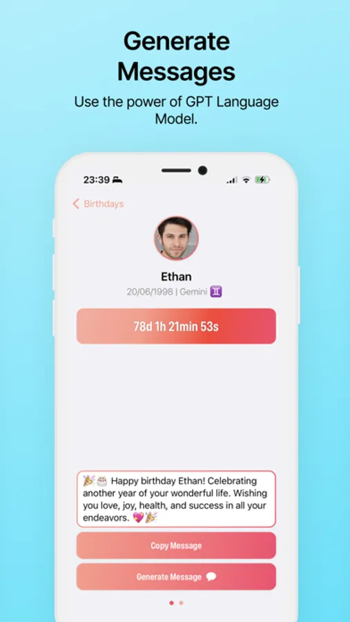 But that's not all! B-Day goes above and beyond with its unique feature that uses GPT language model to generate personalised birthday messages for each contact on their special day. No more generic greetings or last-minute messages - B-Day helps you create heartfelt and meaningful messages that your loved ones will cherish forever.