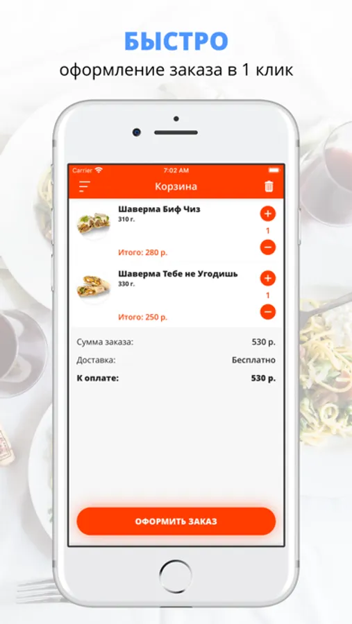 Скачивайте наше приложение, оформляйте заказ и наслаждайтесь любимой едой, где бы Вы ни были! Приятного аппетита!