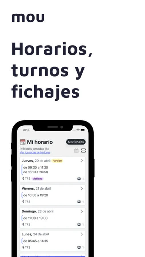 Ficha las entradas y salidas de tus turnos directamente desde la app.