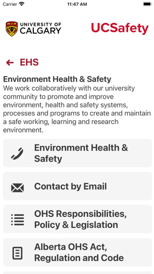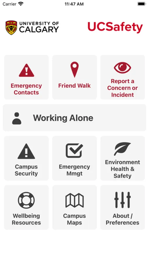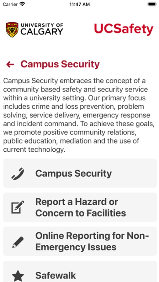UCSafety is the official safety app of the University of Calgary. It is the only app that integrates with the University of Calgary's safety and security systems. Campus Security has worked to develop a unique app that provides students, faculty and staff with added safety on the University of Calgary campus. The app will send you important safety alerts and provide instant access to campus safety resources.