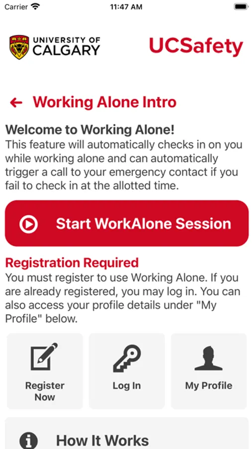 - WorkAlone: Use the app to "check in" with you periodically while working alone or during late hours. If you don't respond, the app will alert Campus Security.