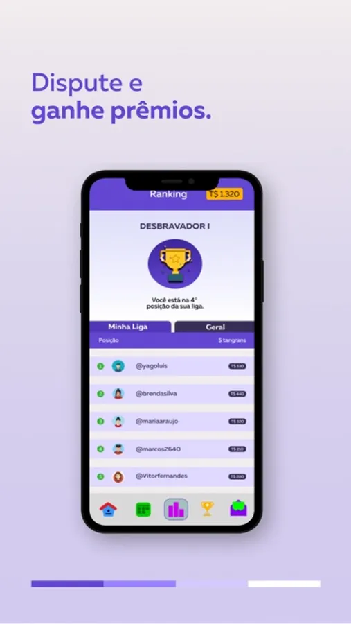 Conhecida como o "Duolingo da Educação Financeira", a Tangram possui uma trilha com conteúdo personalizado, o usuário ganha tangram coins ao acertar os desafios e pode investi-los em uma aplicação de baixo ou alto risco, visualizar o impacto das suas ações na sua carteira digital e ganhar prêmios.