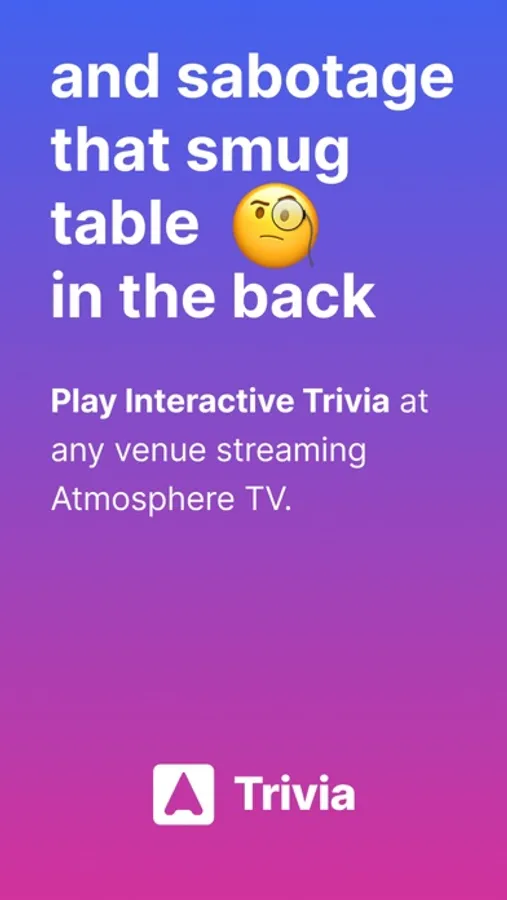 Check out Atmosphere Interactive Trivia! From the people who brought you Chive TV and Atmosphere TV comes the ultimate battle of wits. Play trivia with friends, sabotage your nemeses, and turn a good night into a great one. Our interactive trivia is meant to be played with its companion TV experience. Find a venue with an Atmosphere TV near you and enjoy the immersive and engaging experience!