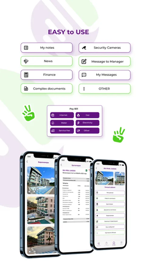 The "EasyLife HOMES" section is the only app of its kind to control your own or rented property. Payment of utilities (electricity, water, internet, Aidat), delivery of bottled water or gas. Viewing online cameras. Communicating with the Manager of the house using the built-in messenger with automatic translation of any language. Search for housing to buy or rent by given parameters.