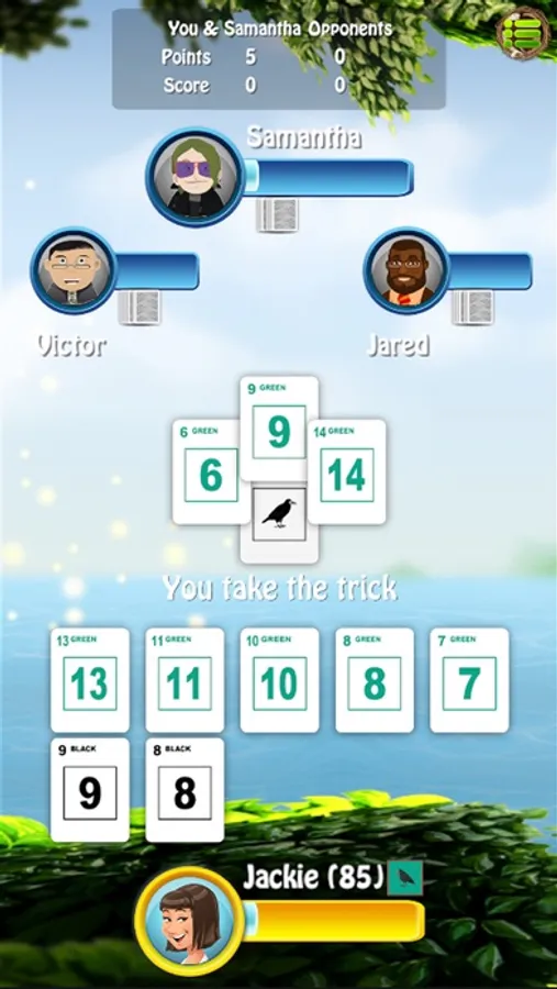 This app is a card game similar to tournament rook. Play with 12 different AI characters, each programmed with different skill levels and playing styes.