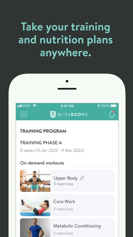 With the BlissBodyU App, you will have access to workout programs designed specifically to help you reach your fitness and health goals! You can follow & track your workouts, your nutrition, your lifestyle habits, measurements and results–all with the help of your coach.