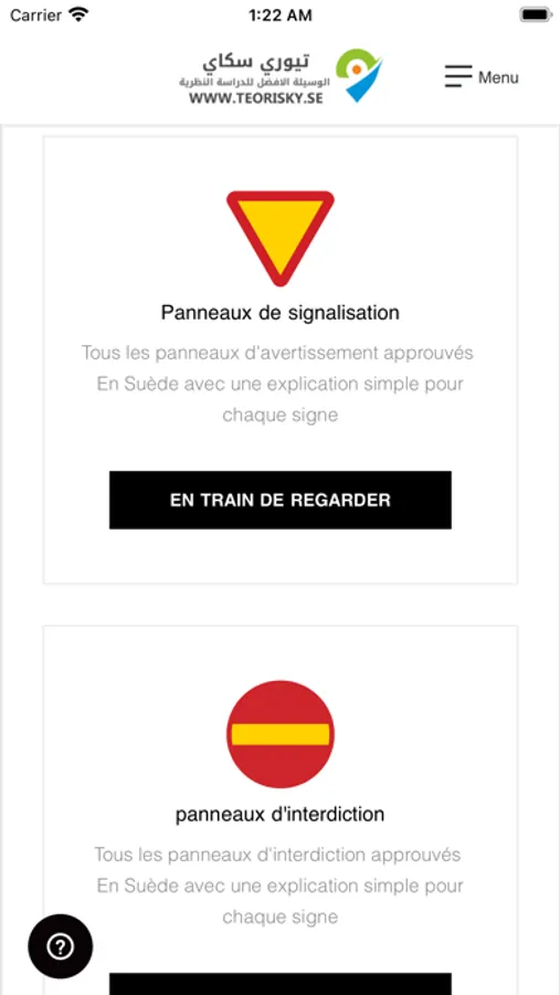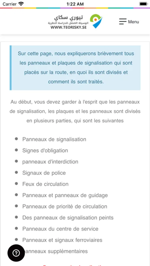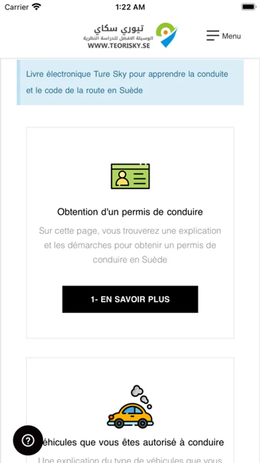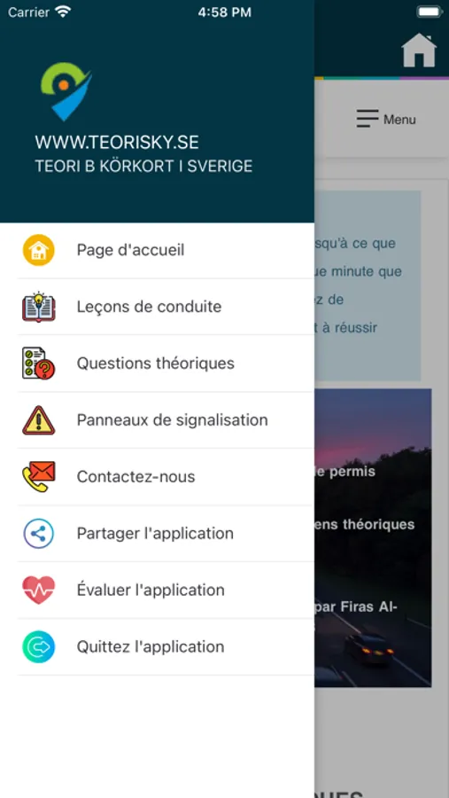 Teorisky - le livre de permis de conduire électronique en Suède en langue française, permet à l'étudiant d'étudier pour le permis de conduire théorique en Suède car il contient des modèles de questions théoriques et des cours de conduite théoriques de manière coordonnée et détaillée.
