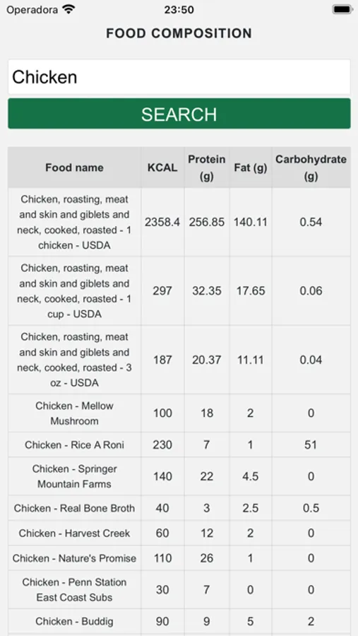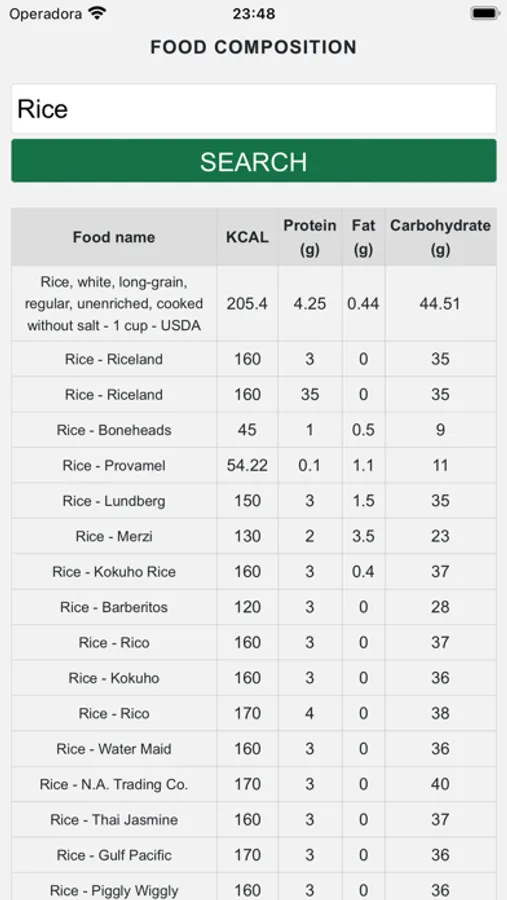 It features the USDA food table, providing accurate data on calorie count, protein, fat, and carbohydrate content.