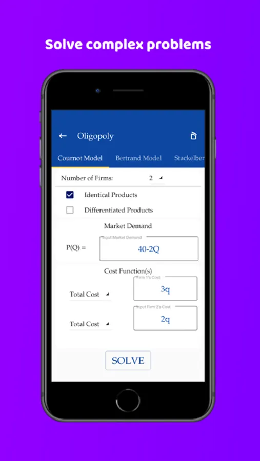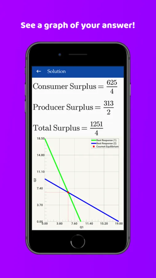Econ Solver was created to help students tackle complex problems from a variety of economics topics. Want to know the equilibrium price and quantity for a demand and supply problem? Econ solver will do that for you! Not only that, but Econ solver will give you the Consumer Surplus, Producer Surplus, Deadweight Loss, and plot the solution for you! Did your professor ask you to solve a 2-firm Cournot Oligpoly Model? Econ solver can do that and so much more!
