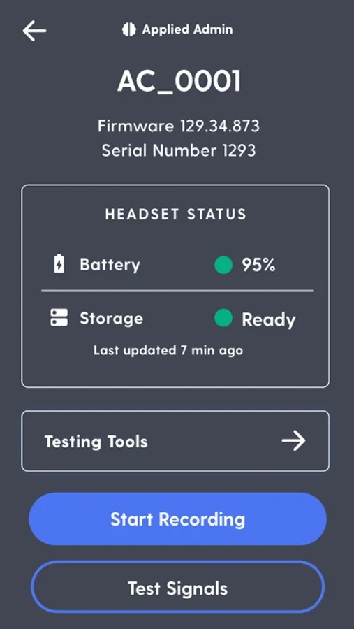 Applied Admin by Applied Cognition, Inc is a clinical research smartphone application that serves as a companion to our Investigational Device (IDE) intended ONLY for use in IRB approved clinical studies sponsored by Applied Cognition. The purpose of this app is to support clinical study enrollment and support device setup. Applied Admin is intended solely for the purposes of clinical research only and any information collected by this application is protected health information covered by HIPAA. The use of this app requires prior consent and approval to participate in clinical studies authorized for use by Applied Cognition, Inc ONLY. Please note that this app is NOT intended for medical use and does NOT provide any diagnosis or treatment. Please refrain from using this app if you have NOT consented to participate in a clinical research study sponsored by Applied Cognition, Inc.