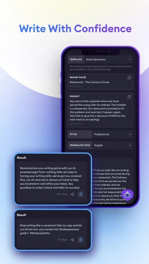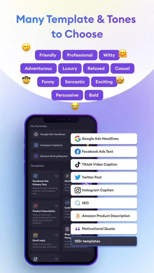 Whether you're a professional writer, a student, or just someone who wants to improve their writing ability, this app is perfect for you. With a wide range of templates available, you can easily create content for SEO, ads content (Google, Facebook, Tiktok,...) , social media, and many more. The app also provides support for professional writing skills, essay writing, email writing, and other writing styles. Our app is designed to help you write better, faster, and more efficiently. With our advanced writing AI, you can improve your grammar, syntax, and vocabulary. You can also use our templates to create content that is optimized for search engines, social media, communication and other platforms. Whether you're a beginner or an experienced writer, our app is the perfect tool to help you improve your writing skills.