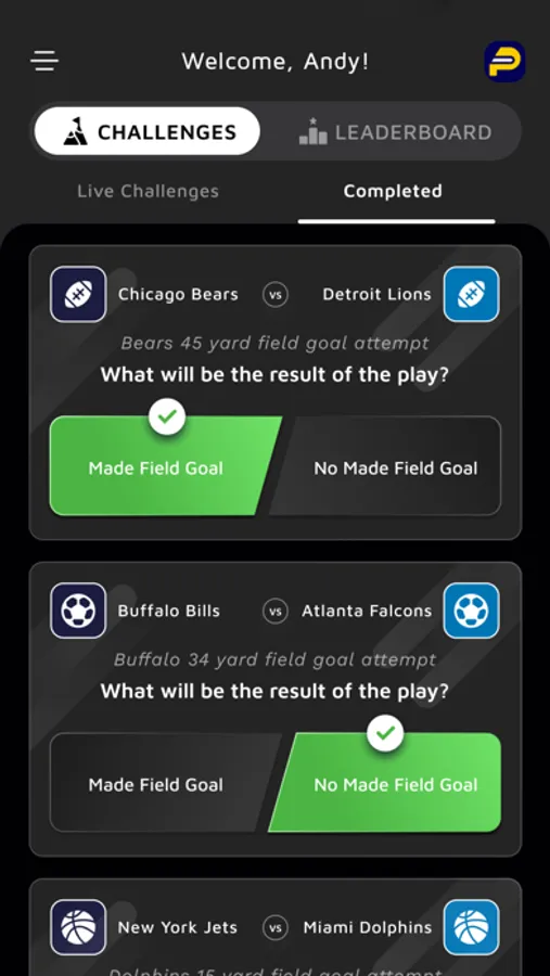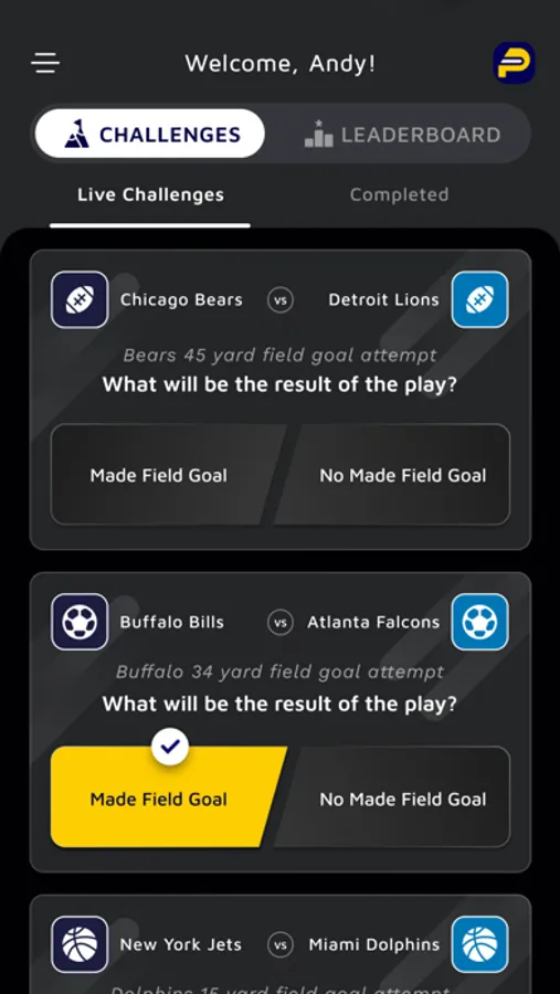 Challenges are generated in real time throughout a sporting event which allows you to play along live with the players on the field.