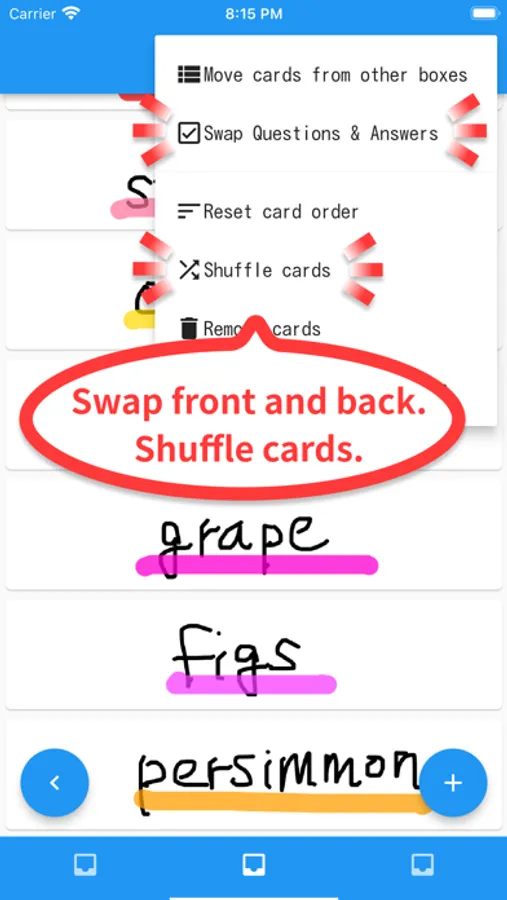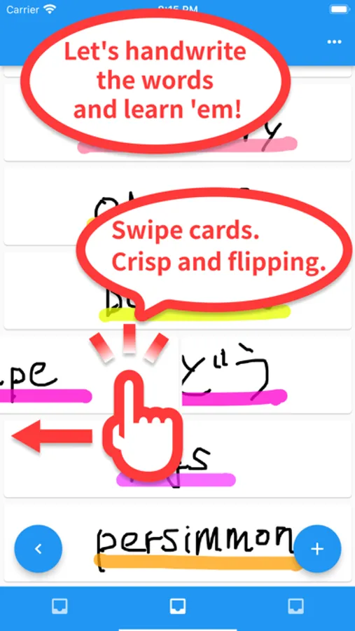 The word card has three boxes (tabs). Swiping left moves the word card to the left box, and swiping right moves it to the right box. When swiping, the "answer" will be visible behind the card for a certain period of time. Swipe quickly and memorize words repeatedly.
