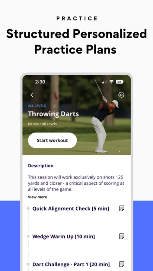 No matter how much or little time you have to dedicate to golf, we can help build a roadmap to your goals, adapt the plan as needed and hold you accountable for your progress. Start having fun on your golf practice journey with daily challenges and games to keep you engaged while you improve. Get a balanced practice schedule to make sure you are practicing all areas of your game.