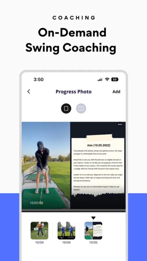 • Monitor your swing progression through progress photos uploaded by your coach.