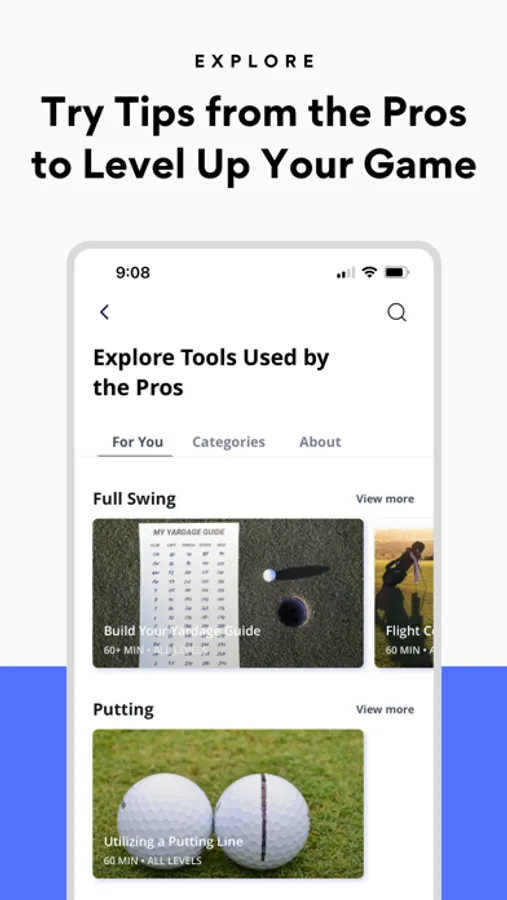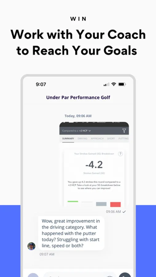 Contact your coach anytime through the in-app messaging option. Work on swing mechanics, the mental side of the game and your playing strategy. Review results from practice sessions and rounds to reassess your personalized plan and make sure you have a clear roadmap to achieving your golf goals.
