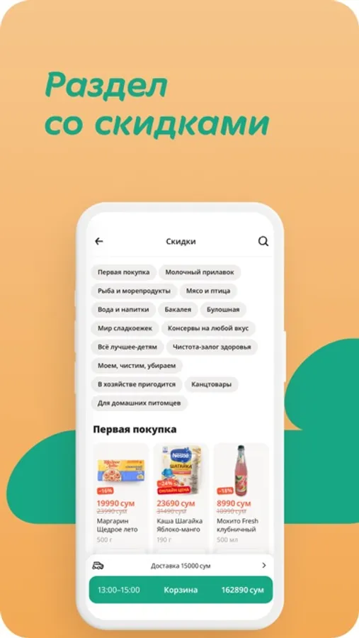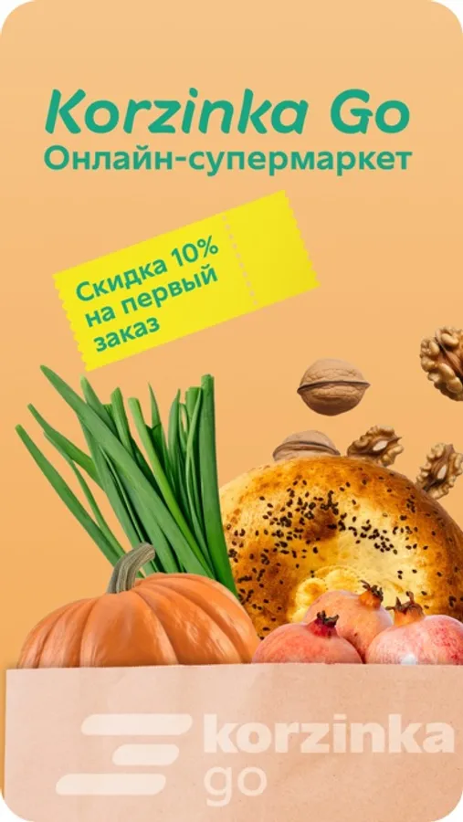 10% скидка на первый заказ. Акции, промо и скидки, как в магазинах Корзинки, и даже больше. Дополнительные интересные предложения эксклюзивно в приложении Korzinka Go.