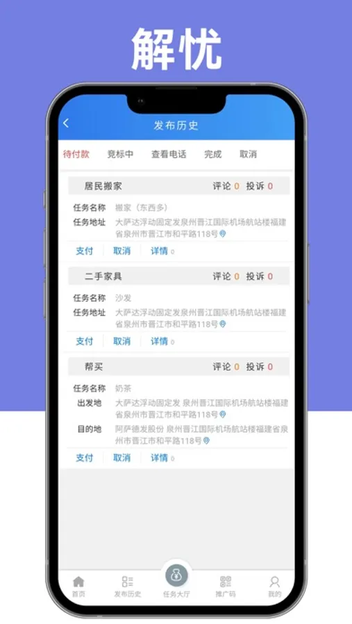 逸品铭祥传承(福建)网络科技有限公司旗下《解忧》app打造全新同城信息交互平台,每个人都可以发布任务和参与任务。