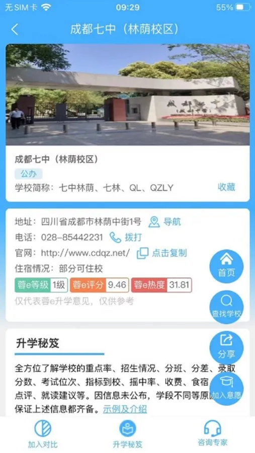 学校信息(基本信息、评分、等级、热度、环境设施、师资、教育特色、收费情况、招生情况、出口情况、指标到校、摇中率、重点率、专家点评等)。