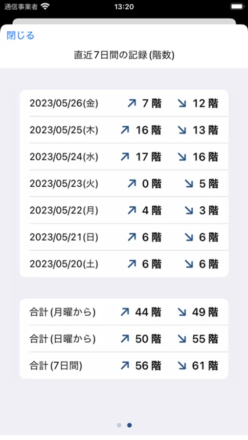 iPhoneの過去7日間の履歴画面では、横にスワイプすると[歩数・距離]⇔[階数]のページを切り替えられます。
