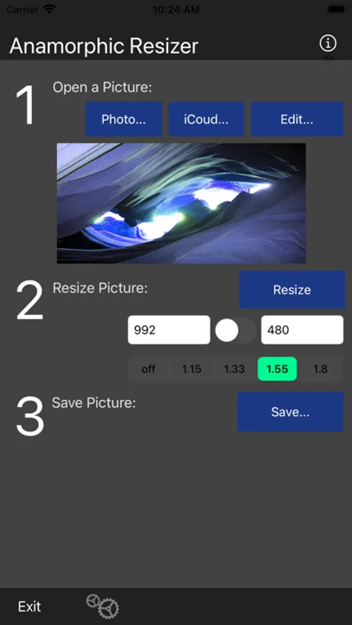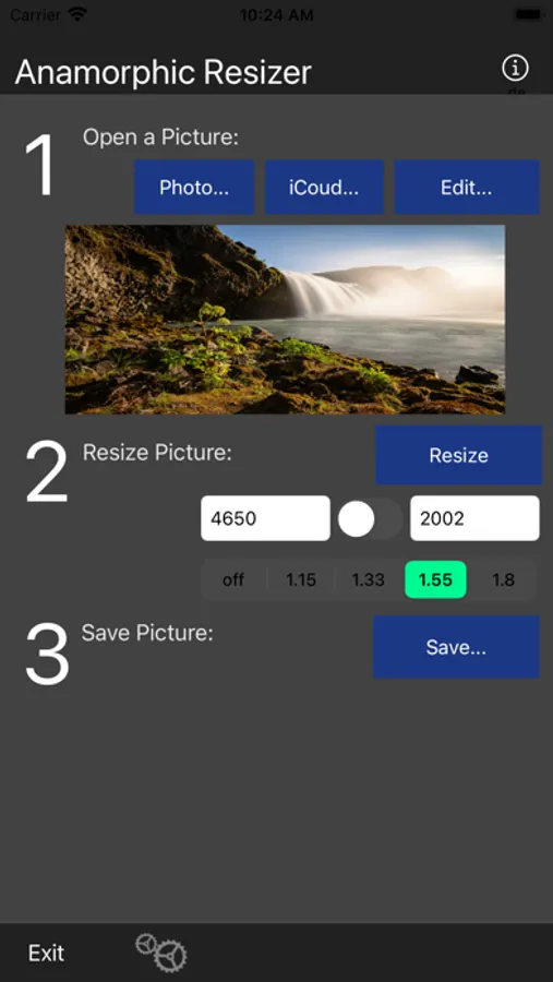 With an anamorphic lens you can not only create videos but also take photos. With it, you can easily get beautiful panoramic images in high resolution. These photos are naturally distorted. With this app you straighten your photos so that they have the correct width and height. 3 easy steps: open photo, adjust size, save image. A preselection with 1.15x, 1.33x, 1.55x and 1.8x is included. You can also adjust the values manually.