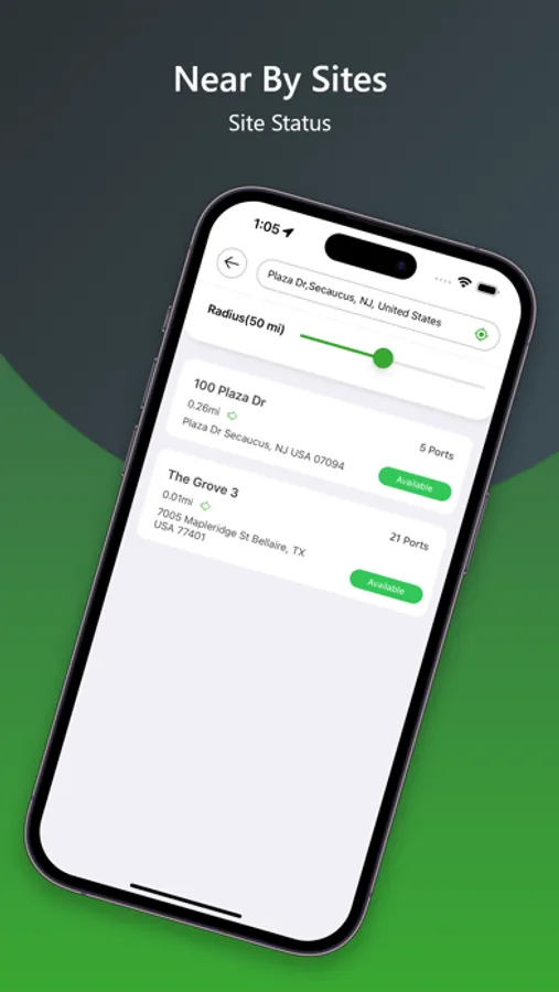 - Default Map with site cluster and with port status: The map view displays charging ports as clusters, making it easier to find the nearest one.
