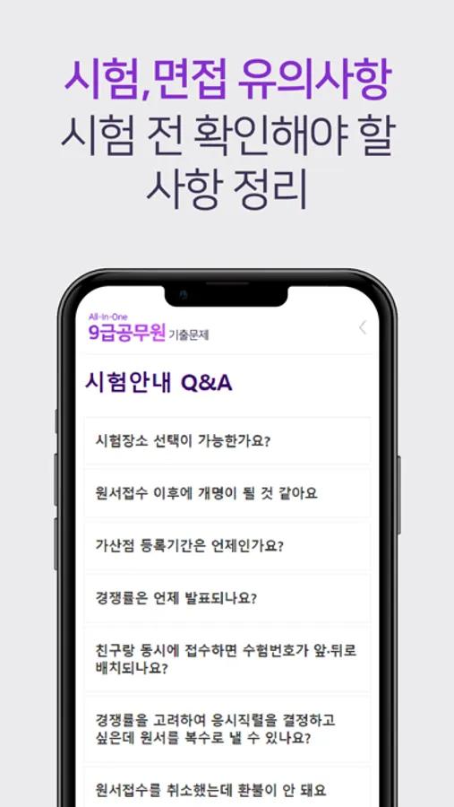 9급 공무원 시험 관련 자주 묻는 질문과 문의사항을 한 번에 모아 궁금증을 앱하나로 해소할 수 있도록 제공하고 있습니다.