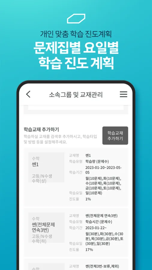 문제집별 진도계획이란, 각각문제집을 페이지나 문제단위등록후, 요일별로 진도계획이 가능합니다. 등록할때는 제외부분도 등록가능하고, 진도계획에서 제외됩니다. 필요하다면 해제도 가능합니다. 진도계획을 세울려면 학생상황마다 진도계획이 다양해야 합니다. 그래서 진도계획도 다양하게 계획이 가능합니다. 진도계획은 학습시간기준, 학습양기준, 마치는 날기준, 몇등분기준, 단원기준으로 다양하게 진도계획을 세우는게 가능합니다. 학생의 학년, 실력, 문제집구성등 다양한 환경에 맞춘 최적의 진도계획을 세울 수 있습니다.