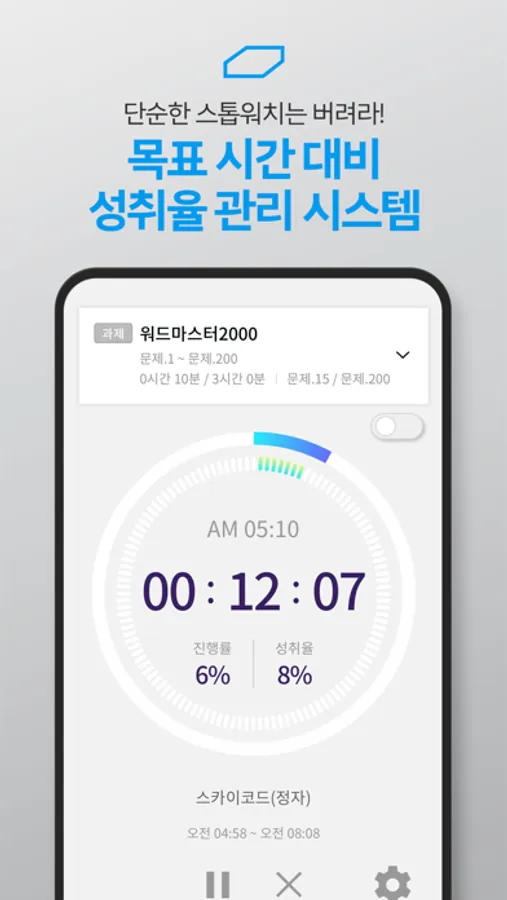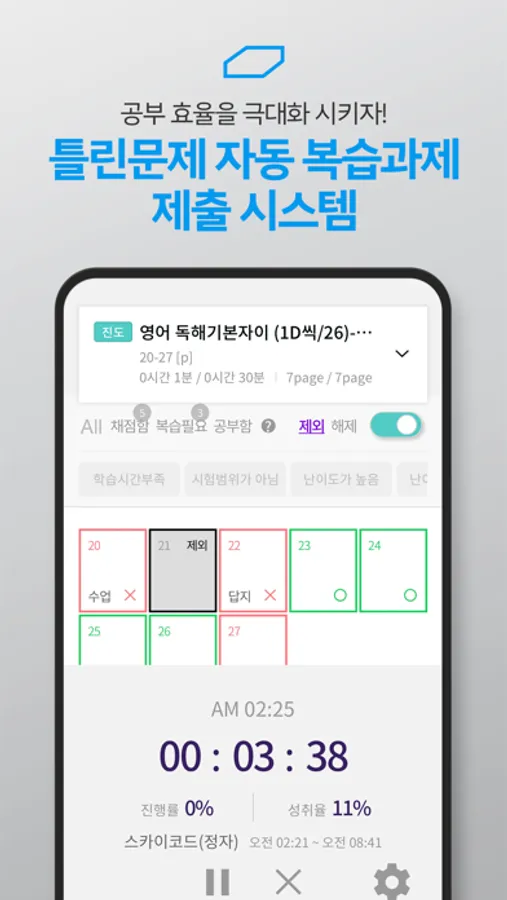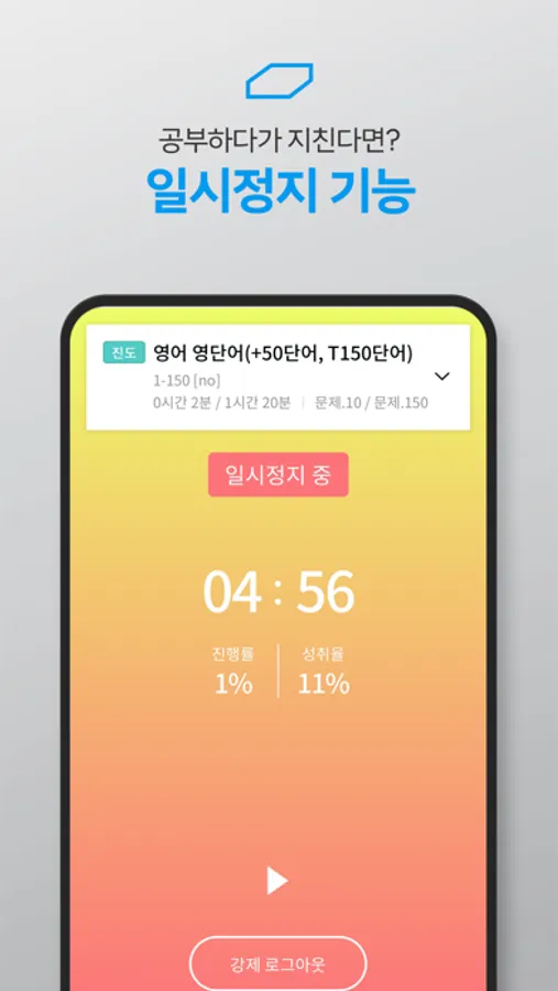 일시정지기능: 학습중간 이런 저런 이유로 학습을 중단해야 할 상황이 생기면 일시정지 기능이 있습니다. 화장실 갈수도 있고, 잠깐 편의점 갈 수 도 있습니다. 이때는 학습카운팅은 되지만, 순공시간에는 포함되지 않습니다. 학습카운팅에서는 회색으로 처리 됩니다.