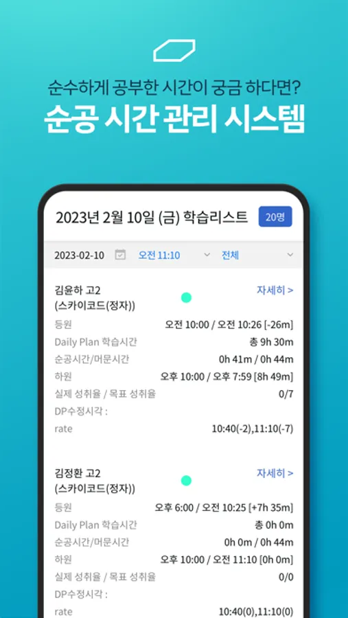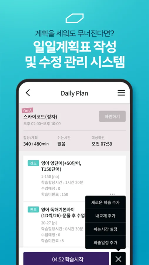 일일계획표작성및 수정관리: 진도계획이 유지되도록 도와주는 시스템입니다. 진도계획표를 세우더라도 학교수행평가, 단원평가, 학교과제등 매일매일 상황이 바뀝니다. 그래서 진도계획을 세우더라도 그대로 유지하는것이 어렵고, 너무 자주 바뀌므로 많은 학생은 진도계획세우는것을 포기합니다. 그런데, 진도계획을 기준으로 매일 학습계획이 변경이 가능하다면 진도계획을 유지할 수 있습니다. 물론 진도계획대로 100%로 실행은 못하더라도 해야하는 진도계획은 항상 관리가 되고, 출제가 됩니다. 일일계획표 작성을 할려면 우선 새로운 학습추가(수행평가,학교과제등 진도계획표에 등록하지 않는 교재), 내교재추가(단원평가를 준비하기 위해서 진도교재로 등록한 교재를 진도계획이 없는데 학습할 경우), 외출(병원,가족식사,조별과제등 학습자리에서 떠나야 하는 경우)을 설정할 수 있습니다. 이렇게 추가가 된다면 기존 진도계획은 학습양을 수정가능하도록 합니다. 일일계획표에서는 중요한것은 각각의 문제집별 계획마다 학습예상시간을 입력해야 합니다. 그래서 언제쯤 하원이 가능한지 예상하원시간을 보여 줍니다. 물론, 처음 계획을 세우더라고 몇 시간이 지나면 계획대로 안됩니다. 그래서 학습중간에 일일계획표는 수정가능합니다. 이렇게 하므로 학생이 아무런 계획없이 공부하는 습관이 아니라 항상 계획을 세우고 언제까지 끝내야 한다라는 목표의식을 가지도록 도와줍니다. 자신의 계획세운대로 잘하는 학생이 메타인지가 좋은 학생이 됩니다.