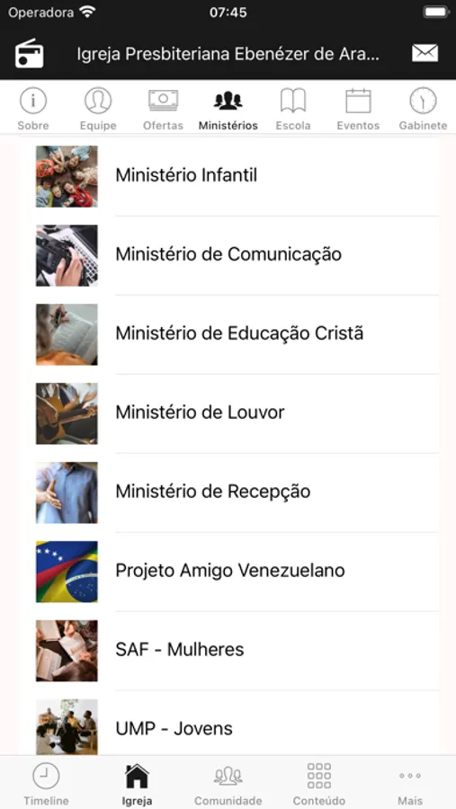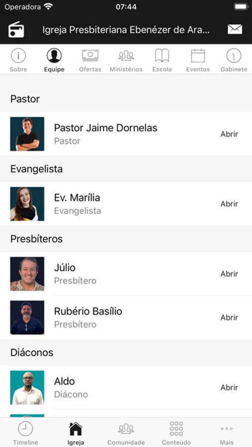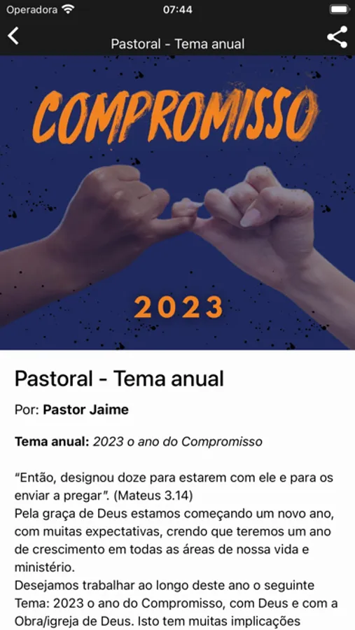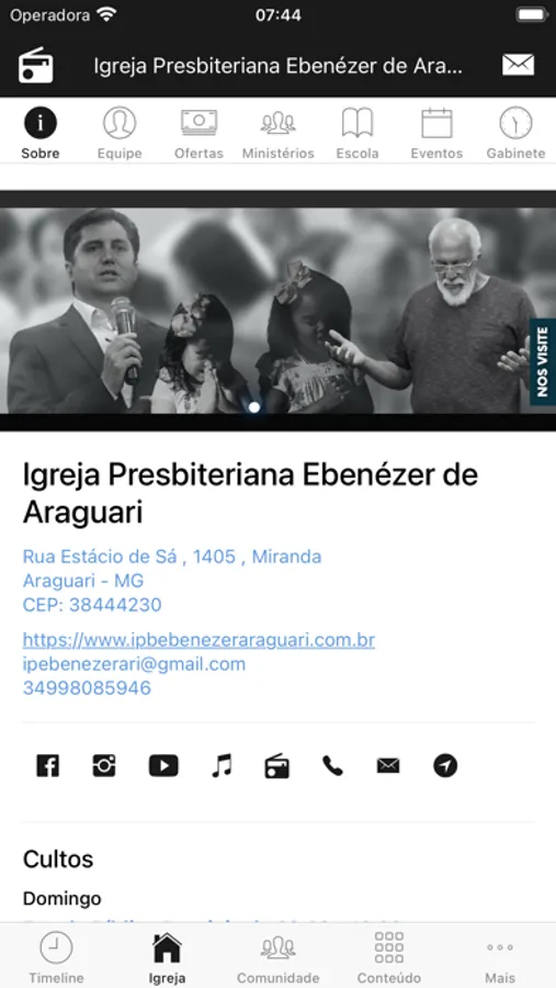 - Informações da Igreja (endereço, telefone, site, redes sociais, pastores)