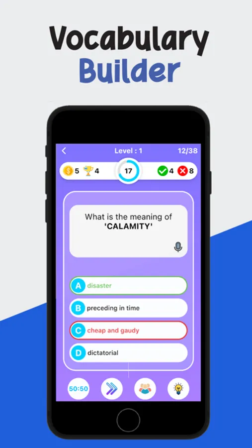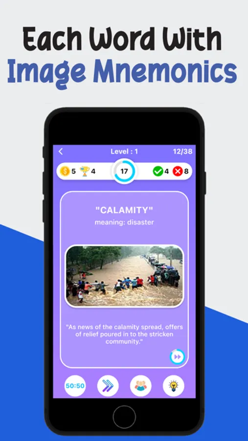 This quiz is having more than 3500 words divided into 100 levels. One user needs to clear the previous level to unlock the next level. The levels are designed in terms of increasing order of difficulty so that aspirants enjoy the levels as well as gain confidence. We have lifelines like 50:50, audience poll, skip a question, Sentence hint to help the user. A user needs to gain coin to access those lifelines. A user gets 5 points with each correct answer and loses 2 points for each wrong answer. In each level, a user will win coins based on their performance, which will help to avail of the lifelines. After completion of each level, user can review the answer with the word meaning, image mnemonics, as well as the sentences using the high frequency words.