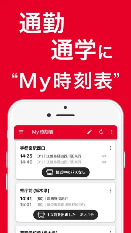 ・自分がよく利用するバス停を登録し、直近2件の運行時刻や接近情報(バスロケ)や遅延情報を確認できます。